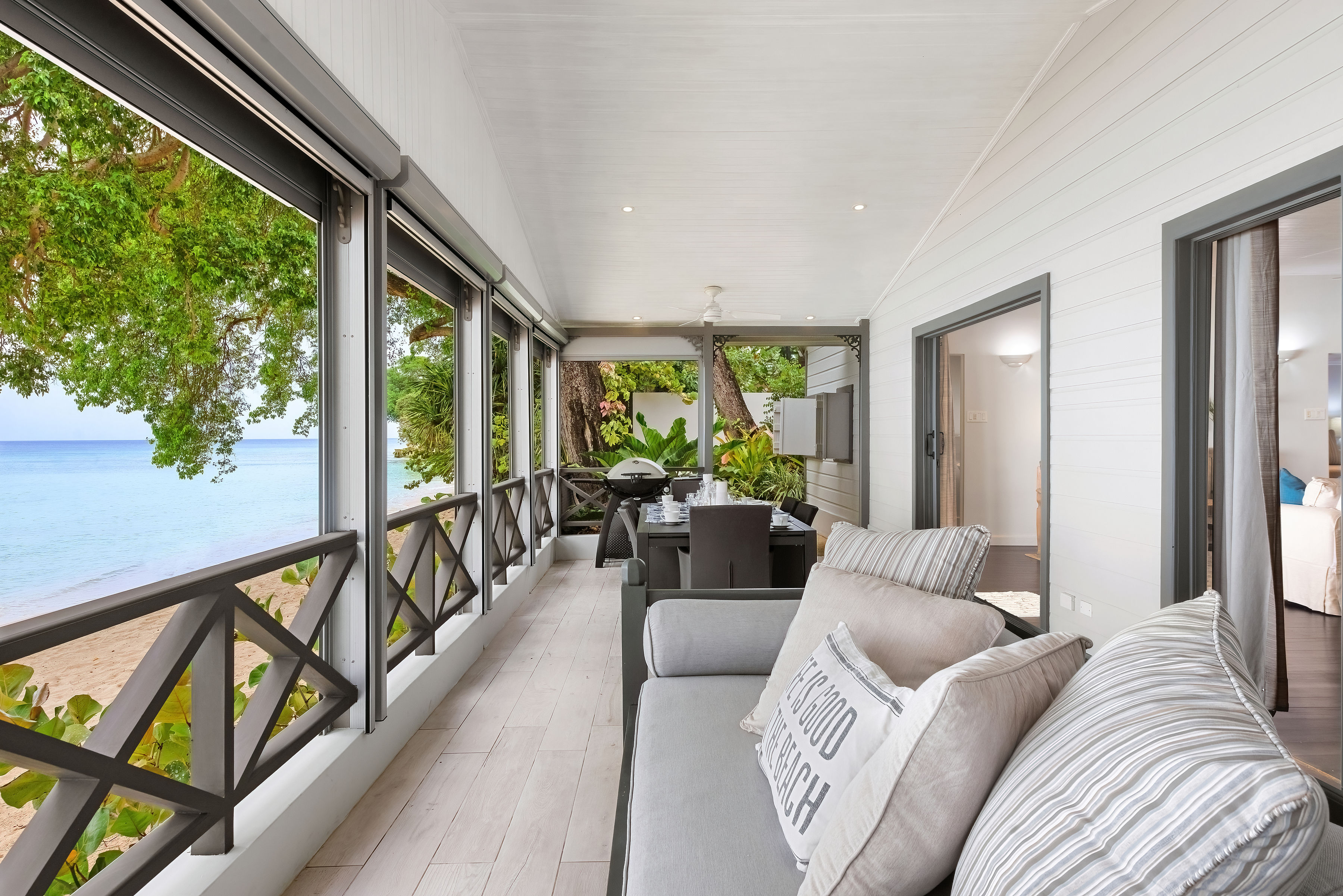 The covered terrace is perfect for casual dining or just relaxing with a favorite book. The twelve foot wide glass entry doors slide open seamlessly inviting the outside in, welcoming guests into the great room. The great room is an open plan area with an over-sized linen couch and antique Barbadian chairs. A well-appointed and modern kitchen with all the comforts of home sits on the far side of the room adding a touch of cool elegance to the classic comfort.